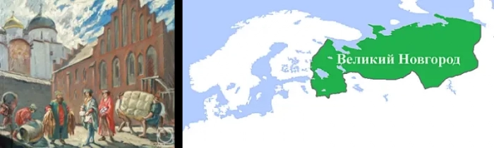 На изображении слева картина Г. Добровольской «Великий Новгород». Справа — карта территории Великого Новгорода. Не надо думать, что это был всего лишь один город — его восточная граница простиралась до самых Уральских гор...