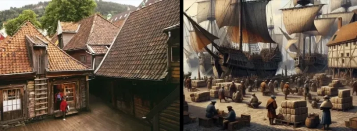 На фото слева: за красочными фасадами исторического памятника Бергене сохранилось множество купеческих домов. Источник: издательство De Agostini. На фото справа: типичный средневековый морской порт.