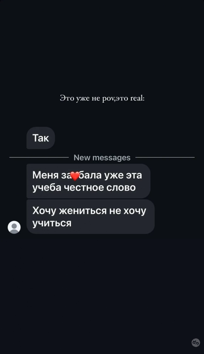 Киба опубликовала переписку, в которой собеседник пожаловался, что устал учиться: "Хочу жениться, не хочу учиться". На это Аврора написала: "Это уже не pov, а real" [реальность].