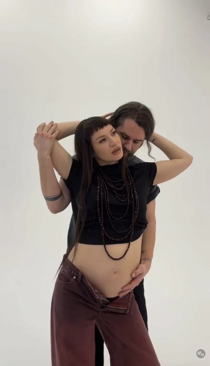 Вернувшись в Россию, Галич отправилась на фотосессию вместе с будущим мужем. Ида надела бордовые штаны, бусы и черный топ, который оголил ее живот. Олег же стоял сзади и мило обнимал невестку.