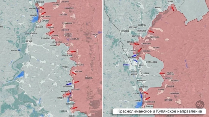 На Купянском фронте развивается наступление на северном фланге. МО заявило об освобождении Новомлынска в 5 км к северу от Двуречной. Поступают сообщения об успехах в районе с. Калиново примерно в 7 км к югу от Двуречной. Сообщают также о форсировании реки возле границы с Белгородской обл. - у села Тополи. Потенциально это начало еще одного плацдарма в 20 км к северо-востоку от Двуречной, и он тоже должен оттянуть на себя часть резервов ВСУ.