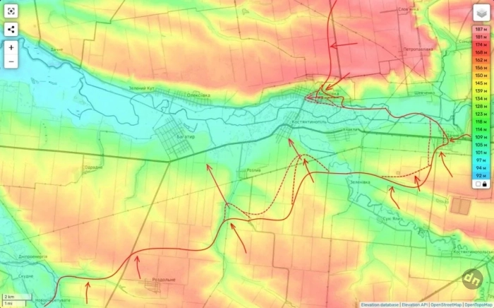 Одновремнно с юга идут атаки уже жилой застройки этого самлго населенного пункта (Константинополь). А еще ресурсы противника сообщают о нашем вчерашнем (к сожалению неудачном) рывке на н.п. Богатырь (мы смогли дойти до окраин села, но были отражены).