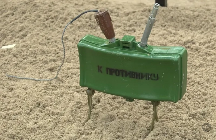 А вот вариант, когда мина МОН-50 ориентирована вперёд, по направлению полёта FPV-дрона, о чём мы ранее и говорили.