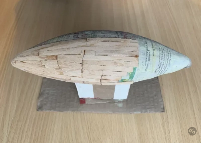 Теперь пластилиновый корпус в три слоя покрывается кусочками размоченной в воде газетной бумагой: первый слой только на воде, вторые два на клею ПВА. Хорошо просушив бумажную «скорлупу» и обрезав свисающие с корпуса края, оклеиваем ее палочками-мешалочками для кофе, стараясь по возможности укладывать их как можно плотнее. Клей – ПВА.