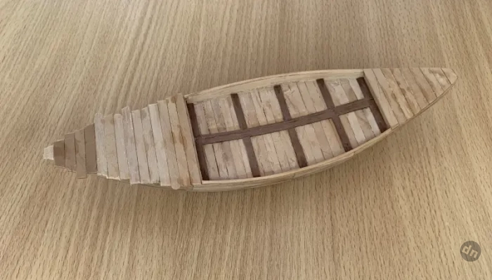 Стойки навеса вытачиваются из подходящих по толщине деревянных брусков, а сами опоры тента можно сделать из сточенных до половины пластмассовых бусинок. Лопасти рулевых весел – из палочек-лопаток для мороженого, веретено весел – китайские зубочистки.
