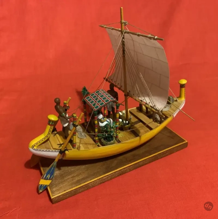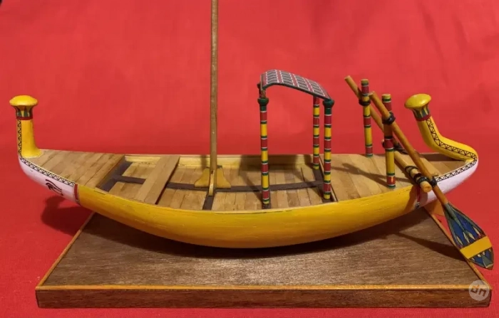 Чтобы получить характерный профиль корпуса египетской ладьи, нужно оснастить ее точно такими же оконечностями, изображающими связки стеблей папируса, как на лодке-оригинале. Сделать их совсем не сложно. Оба профиля оконечностей вырезаются из бумаги (по два профиля на каждую оконечность), а затем на бумагу наносится пластилин, из которого формируют две половинки каждой такой детали. Затем их смазывают маслом, окружают бортиком из пластилина, держат какое-то время в морозильной камере холодильника, после чего заливают не слишком горячим растопленным парафином от свечки. Когда парафин застынет, пластилин из формы осторожно извлекают, а в форму заливают эпоксидную смолу. Таким образом, у нас получаются две пары нужных нам деталей, которые остается только склеить и обточить швы. После этого их суперклеем нужно приклеить на корпус, а места соединений зашпаклевать и зачистить. Красится модель акриловыми красками по рисунку. Палуба покрывается либо бесцветным нитролаком, либо специальным маслом с воском «под дерево».