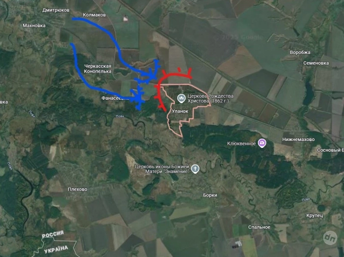 Российская армия продолжает ликвидировать последствия наступления ВСУ в направлении села Уланок. Хотя на земле своей цели противник не достиг, зато в плане пропаганды вполне преуспел: западные СМИ сообщили о прорыве ВСУ на 5 км вглубь российской территории и взятии хутора Колмаков и деревни Фанасеевка. Сейчас остатки сил ВСУ фиксируются в лесополосах под Уланком (около 8 человек), у Черкасской Конопельки и в лесу к востоку от Фанасеевки в урочище Соломатино. Российские отряды стараются выбить их с помощью дронов и артиллерии.