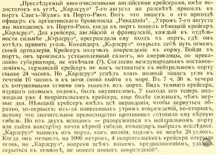 Как я понимаю, на самом деле все было гораздо скучнее. «Карлсруэ» после бегства от британских крейсеров испытывал крайнюю потребность в угле, отчего вынужден был сбросить ход до 16, а потом и до 12 узлов и идти в американский порт Сан-Хуан на Пуэрто-Рико. На крейсере слышали переговоры английских крейсеров и ожидали, что «Карлсруэ» будет вот-вот перехвачен. В этом случае германский корсар был бы обречен, потому что запасов угля ни для бегства, ни для боя у него не было. Но все обошлось, так что «Карлсруэ» добрался-таки до американцев, имея всего только 20 или даже 12 тонн угля в ямах. Никаких героических прорывов как в порт, так и из оного совершать не пришлось – немцы вполне мирно пополнили свои угольные запасы.