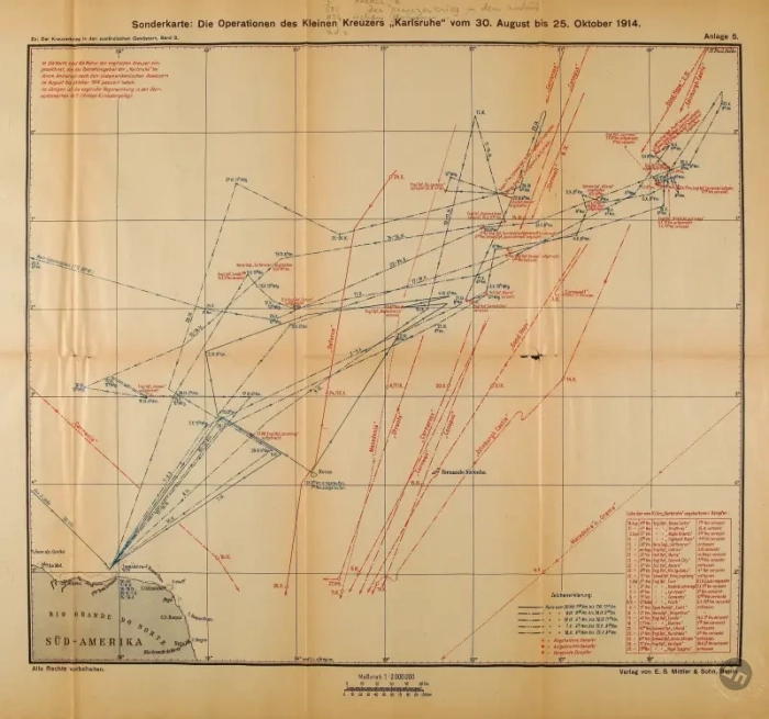 Кризис миновал, и германский крейсер вышел на коммуникации неприятеля. Там он, не встречаясь более с неприятельскими крейсерами, весьма отличился, перехватив и утопив 17 судов тоннажем в 72 805 регистровых тонн. С этими тоннами вечно получается путаница, поэтому уточню, что регистровая тонна — это внутренний объём судна в размере 100 кубических футов (2,83 м3), причем имеется в виду только объем, предназначенный для перевозки грузов, но никак не водоизмещение корабля, которое вполне может быть вдвое больше.