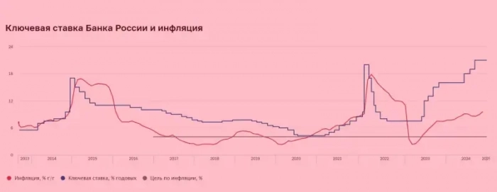В связи с тем, что экономике РФ не удалось выйти на целевые показатели инфляции, стала обсуждаться возможность нового поднятия ключевой ставки. Напомним, что по итогам 2024 года инфляция, по данным Банка России, составила 9,52%. Об этом уровне на минувшей неделе председатель правительства Михаил Мишустин доложил президенту Владимиру Путину. В том же докладе руководитель кабмина сообщил о рекордном объёме ВВП по итогам 2024 году – более 200 трлн рублей. Рост экономики, по словам Мишустина, составил 4,1%, что выше показателя, который правительством прогнозировался.