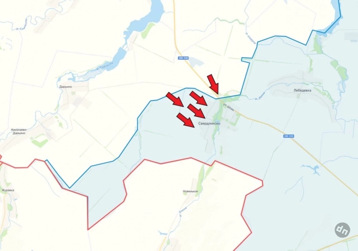 Северо-западнее Суджи наши войска атакуют в районе приграничного села Свердликово. Несмотря на отчаянное сопротивление ВСУ, наши десантники отбивают один опорник за другим, так что большая часть села уже под контролем ВС РФ. Наши войска переправились через реку Локня и пытаются выбить противника полностью из этого села, что в случае успеха будет создавать угрозу трассе снабжения ВСУ Сумы-Суджа. Противник пытается стабилизировать ситуацию на участке фронта, перебрасывает резервы.