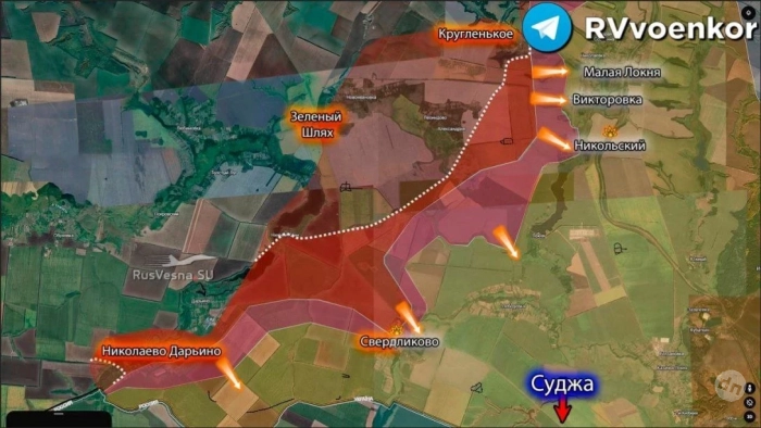 Также части ВС РФ штурмуют хутор Никольский и его окрестности, продвигаясь к железной дороге. Сообщают о ракетном ударе по подразделениям ВСУ, укрывшимся в фермах свинокомплекса «Мираторг» в окрестностях Никольского.
