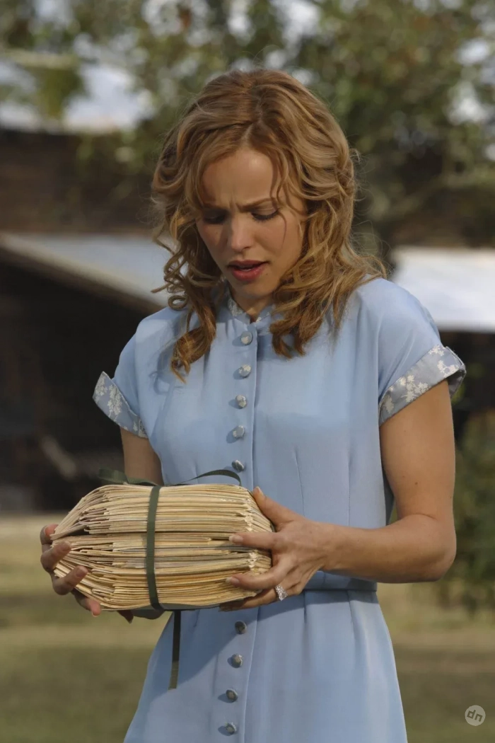 Рэйчел МакАдамс в фильме "Дневник памяти" (2004)/Фото: кадр из фильма/New Line CinemaРэйчел МакАдамс в фильме "Дневник памяти" (2004)/Фото: кадр из фильма/New Line CinemaРайан Гослинг и Рэйчел МакАдамс в фильме "Дневник памяти" (2004)/Фото: кадр из фильма/New Line CinemaРайан Гослинг и Рэйчел МакАдамс в фильме "Дневник памяти" (2004)/Фото: кадр из фильма/New Line CinemaВ фильме "Дневник памяти", одном из самых романтичных, героиня Рэйчел МакАдамс, Элли, одевалась модно по меркам 1940-х. Пожалуй, больше всего Элли запомнилась зрителям в голубом платье приталенного силуэта, когда она целовалась под дождём с любовью своей жизни Ноем (Райан Гослинг). Актёры не просто сыграли влюблённых, но и закрутили роман на съёмках, который продлился целых четыре года. Эта сцена стала культовой и даже получила награду MTV. А повторить образ Элли легко с помощью похожего голубого платья в модный цветочный принт Befree или Gate31.Хочется отметить ещё один наряд Элли, который она надела на свидание с Ноем, — красное мини-платье с геометричным принтом. Его можно заменить на более стильную версию — приталенное платье в клетку No. 21.