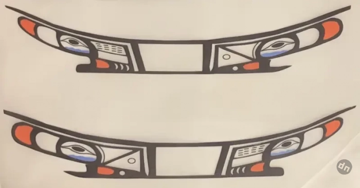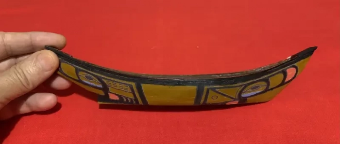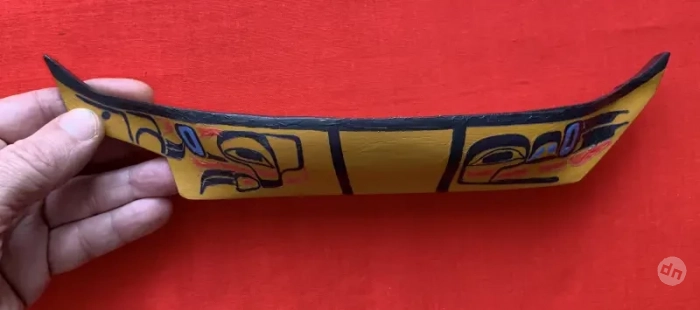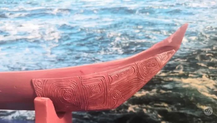 Готовая модель каноэ хайда с нанесённым на борта рисунком из термонаклеек