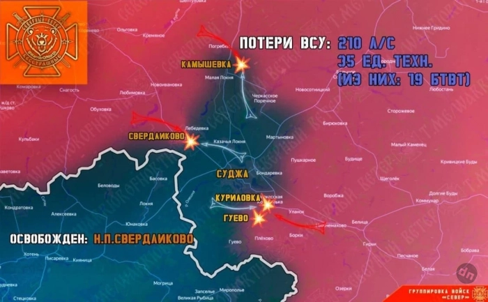 Из Свердликово поступают сообщения, что бои на южной окраине села завершились успехом ВС РФ. Ранее были освобождены центр и северная часть села и зачищены от остатков ВСУ близлежащие лесополосы. Пока официально освобождение Свердликово не подтверждено, но уже говорить об успехе российских сил. От Свердликово потенциально открывается дорога на Суджу.