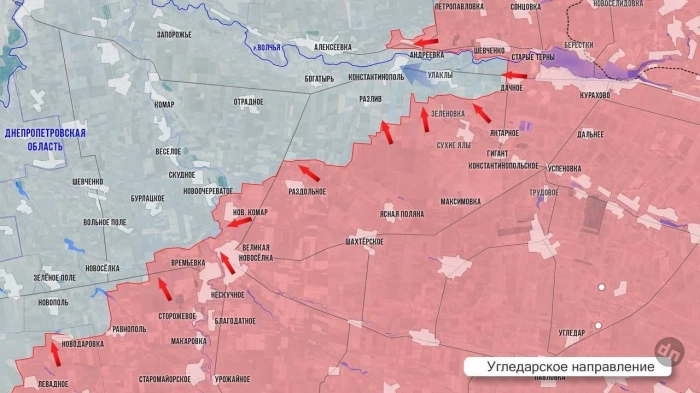 На Угледарском фронте ВС РФ нацелены на выход к Запорожской трассе. Западнее Великой Новосёлки наши прорвались в Новосёлку, идёт штурм, а севернее ВС РФ штурмуют Новоочереватое с прицелом на выход в тыл укрепрайону ВСУ у Бурлацкого. Еще одна наша бригада продвинулась к Днепроэнергии. Восточнее по фронту ВС РФ стараются отрезать восточную часть кураховского «кармана». Часть гарнизона ВСУ окружена в опорном пункте на трассе между Дачным и Улаклы. Вчерашней атакой наши закрепились в юго-восточной части Улаклы. Наш десант высадился на южной окраине Константинополя - встречные бои идут в центральной и юго-восточной частях. На севере «кармана» наши расширяют зону контроля в Андреевке.