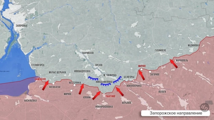 «Российские войска продолжают двигаться после взятия населенного пункта Дачное. Здесь состоялось первое боевое применение тяжелого ударного дрона-бомбардировщика с грузоподьемностью до 35 килограммов на спутниковом управлении», - уточнил канал.