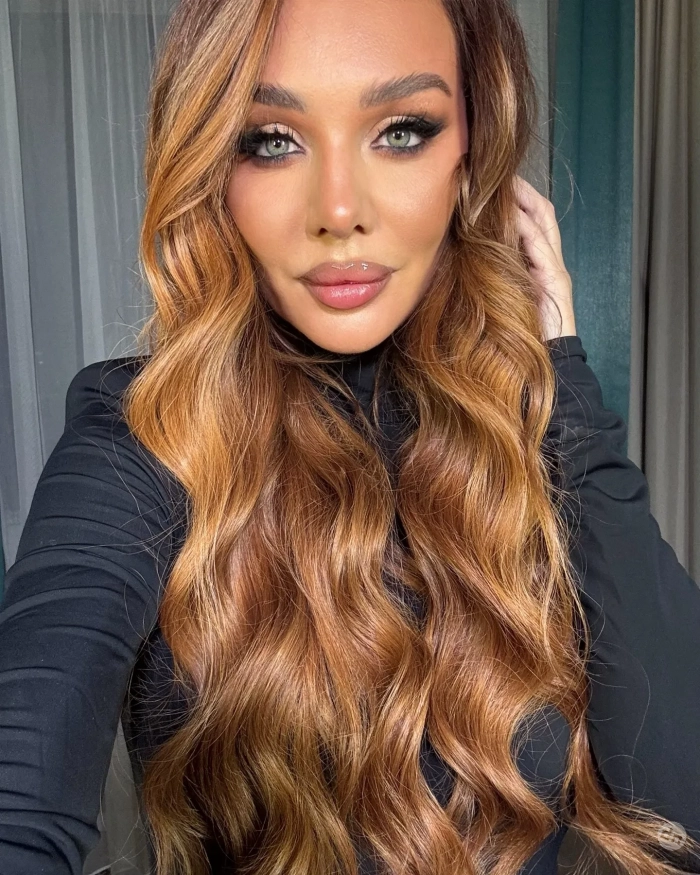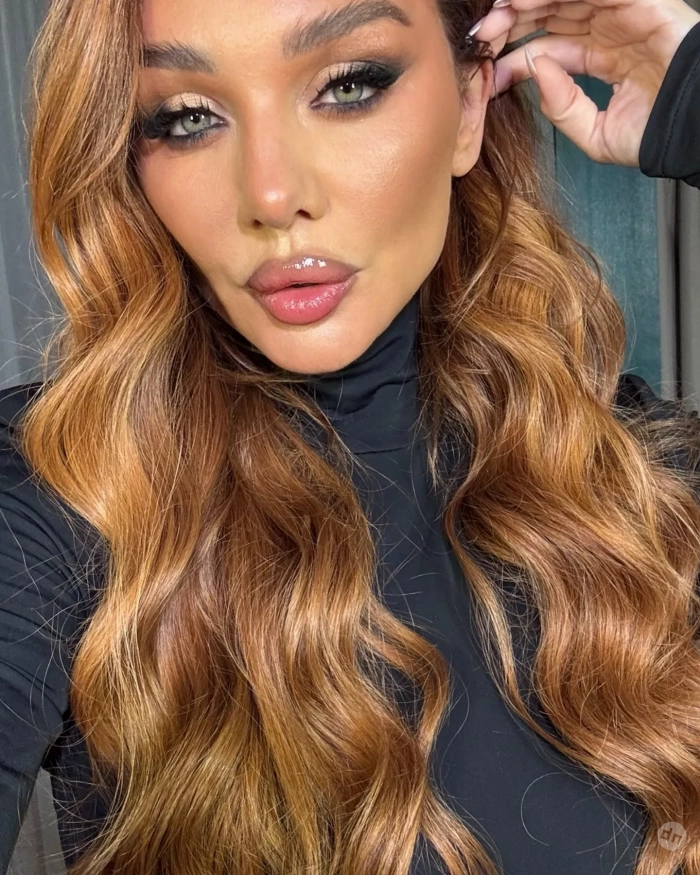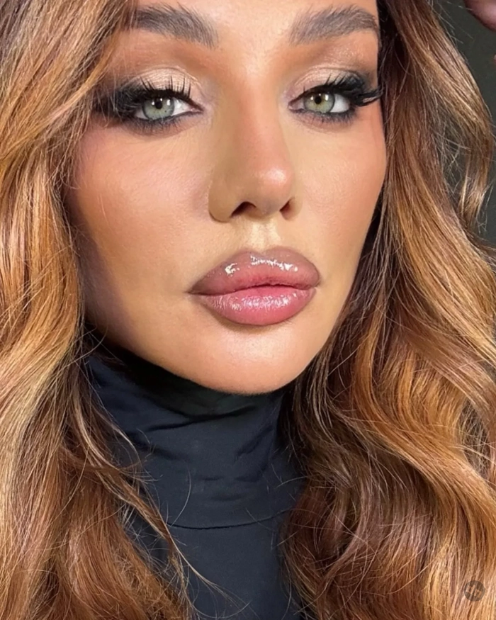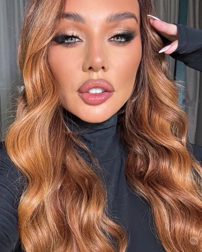 На снимках певица позирует в чёрном джемпере с высоким воротом, дополнив образ ярким макияжем и причёской с кудрями.