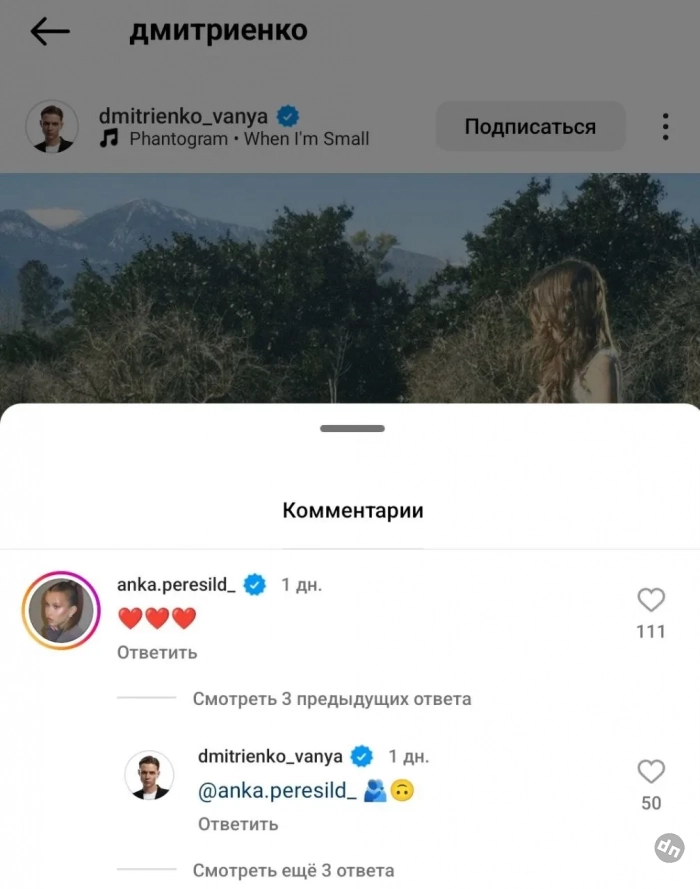 19-летний Дмитриенко опубликовал в инстаграме* подборку фото, среди которых был снимок с 15-летней Пересильд, сделанный, очевидно, во время записи его клипа. "Я люблю тебя, жизнь", — написал он в посте. Пересильд оставила под постом эмодзи в виде сердец, на что Иван отреагировал эмодзи в виде объятий.