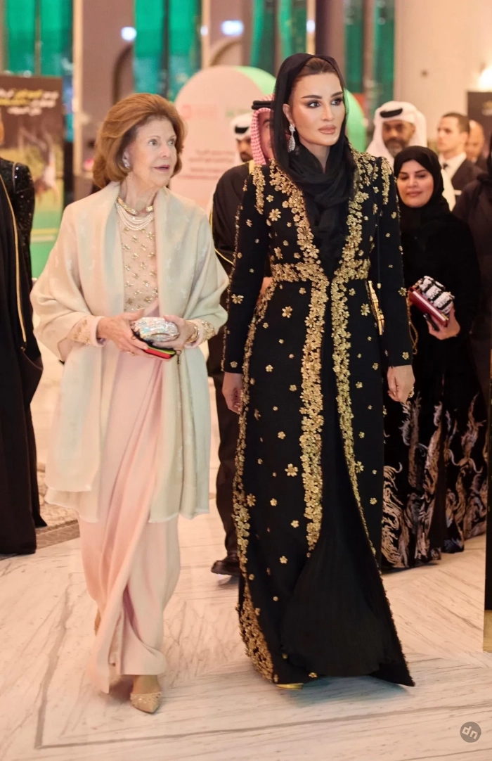 81-летняя королева Швеции Сильвия прилетела с трёхдневным визитом в Катар и посетила гала-ужин в Дохе, где встретилась с 65-летней шейхой Мозой бинт Насер, матерью правящего эмира страны Тамима ибн Хамада Аль Тани. Шейха Моза — нечастая героиня наших хроник, но мимо этого выхода Splentik не мог пройти: слишком роскошно.