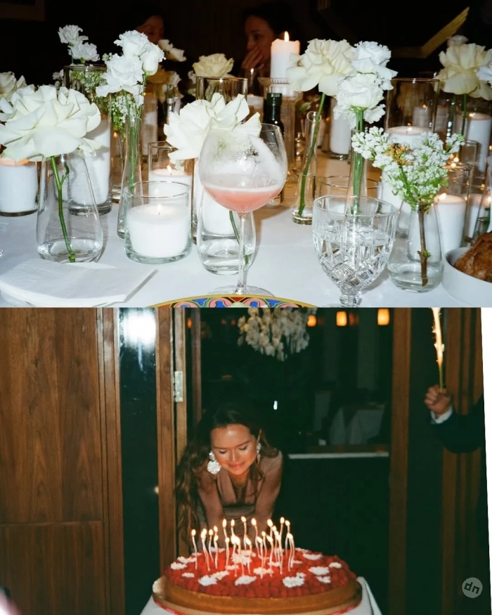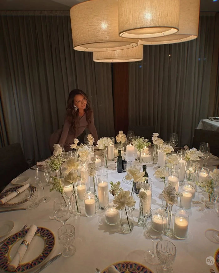 Именинница собрала гостей за круглым столом, украшенным цветами и свечами, и нарядилась в серебристый облегающий костюм собственного бренда Dress by Stesha. Образ блогер дополнила массивными серьгами и кольцом Lili Archive.
