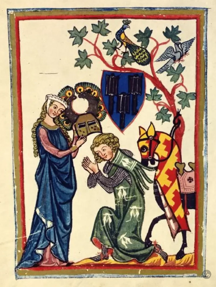 И благодаря «Манесскому кодексу» мы сегодня совершенно точно знаем, как выглядели многие рыцари-миннезингеры около 1300 года. А еще тот же кодекс представляет собой обильный источник визуализированных образов куртуазного поведения. Так, лист 231r, например, показывает рыцаря-миннезингера по имени Винли, который сидит в шатре с двумя дамами, одна из которых вручает ему кольцо и щит, а другая — любопытный шлем, покрытый шляпой, да еще и перевязанный шарфом.