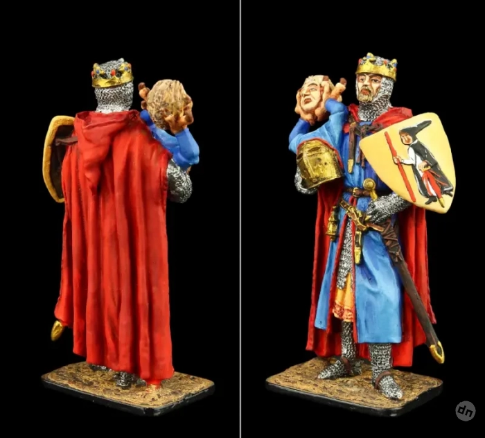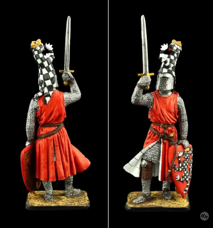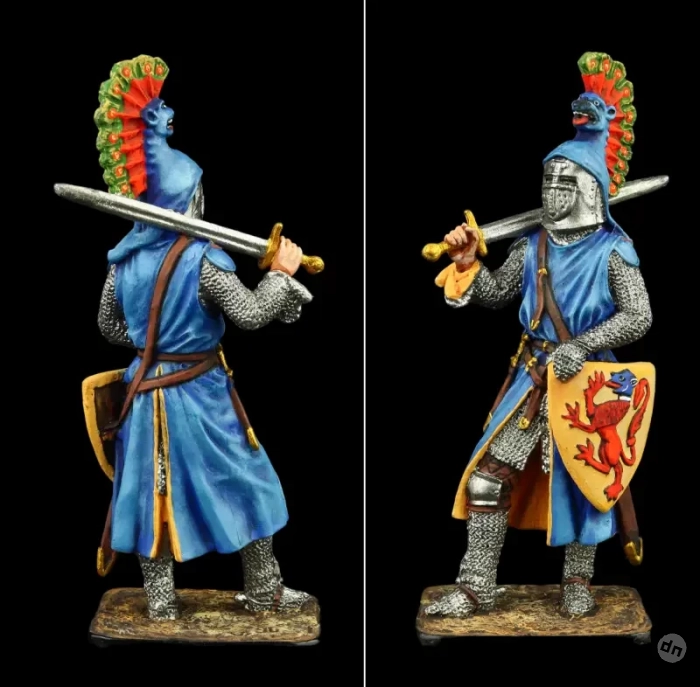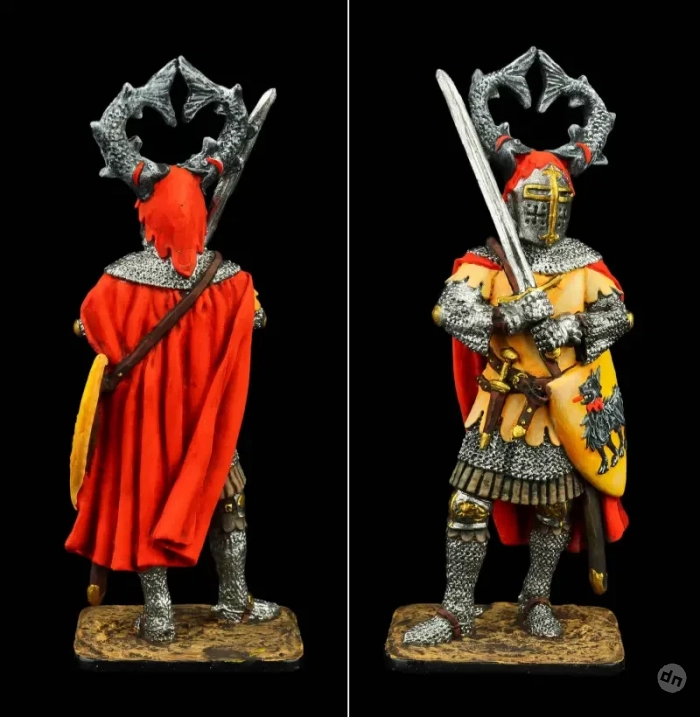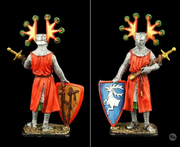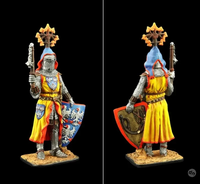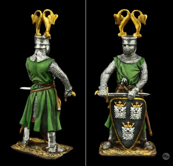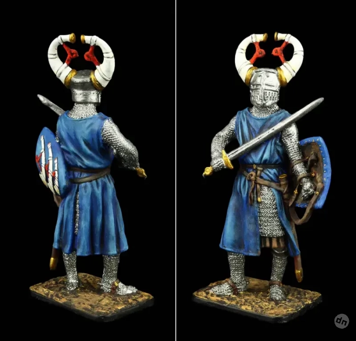 А вот у рыцаря-миннезингера Дитхельм Гоэли (XIII в.) нашлемное украшение и рисунок герба совпадают полностью. Раскрашена фигурка художниками «Silver Dream Studio». На иллюстрации в «Кодексе…» изображен за совершенно мирным занятием – игрой в трик-трак!