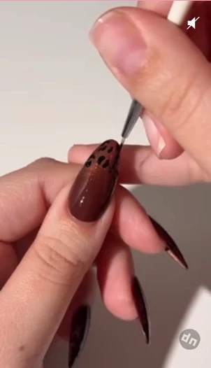 Нарисуйте пятнышки. Окуните тонкую кисть в черный лак и нанесите на кончики ногтей небольшие пятна, создавая эффект леопардового узора.