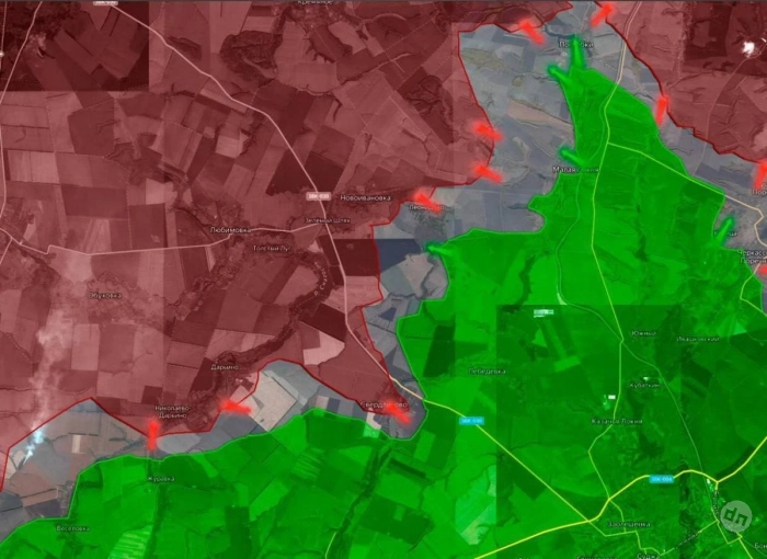 В южном направлении от Свердликово ВС РФ продолжают давить оборону врага и, как сообщалось вчера, зашли на территорию Сумской области, атаковав Новенькое. Наши выбили врага из опорных пунктов на северной окраине, но бои идут очень трудные, противник отчаянно сопротивляется.