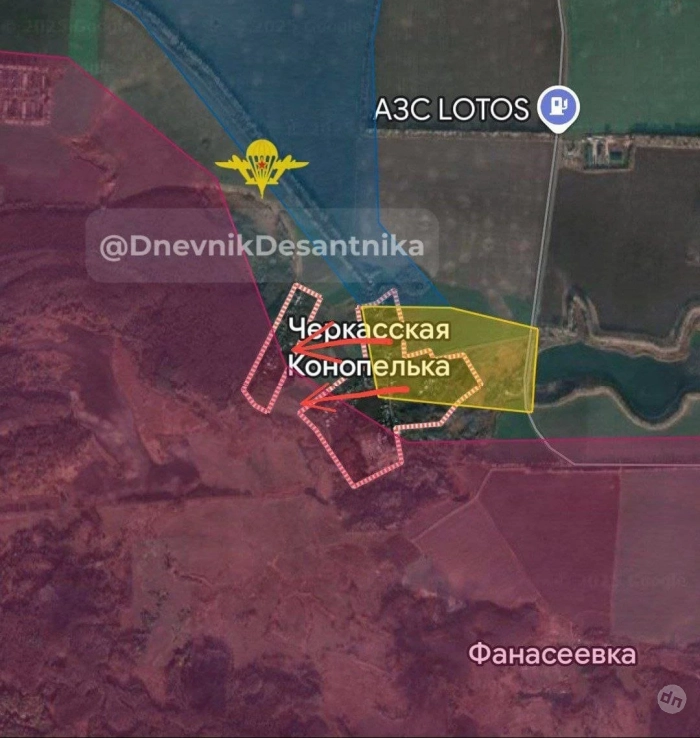 В свою очередь Telegram-канал "Дневник Десантника" информирует о том, что российские десантники продавливают оборону противника и продвигаются на западной окраине Черкасской Конопельки.