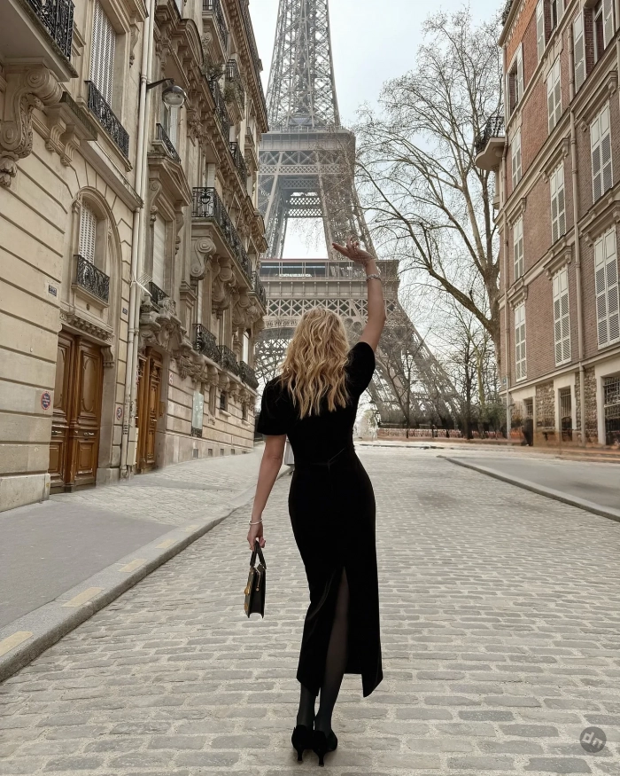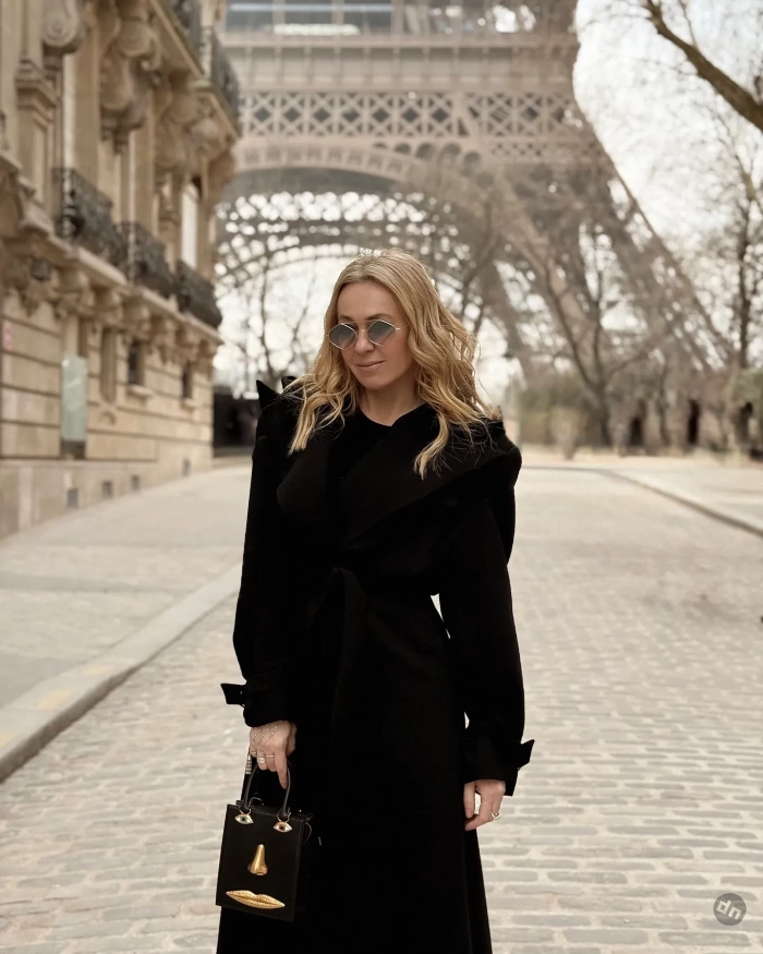 На одной серии снимков Рудковская позирует на фоне Эйфелевой башни в чёрном платье. Образ она дополнила сумочкой "с лицом" и украшениями.