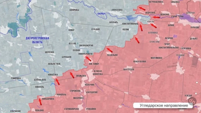 На Угледарском направлении ВС РФ продвигаются вдоль западного и восточного берегов р. Мокрые Ялы, отвлекая резервы противника, так необходимые сейчас в районе Богатыря и Константинополя. С опорой на вчера освобождённое село Новоочереватое наши атакуют Скудное и Днепроэнергию, продвигаются к Комару. Выход в район Комара позволит нашим блокировать группировку противника в Богатыре и выйти в Днепропетровскую обл с юго-востока, обходя с тыла основные оборонительные линии ВСУ в Запорожской обл. На днях был ликвидирован карман восточнее оборонительной линии противника Андреевка-Улаклы, а сегодня наши продвигаются западнее. В Андреевке ВС РФ закрепились в западной части, а противник оставил свои позиции в восточной части села.