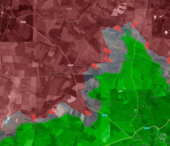 Telegram-канал "БелВПО" пишет о том, что ВС РФ ведут штурмовые действия в Лебедевке, а также южнее Свердликово, давят в направлении Новенького.
