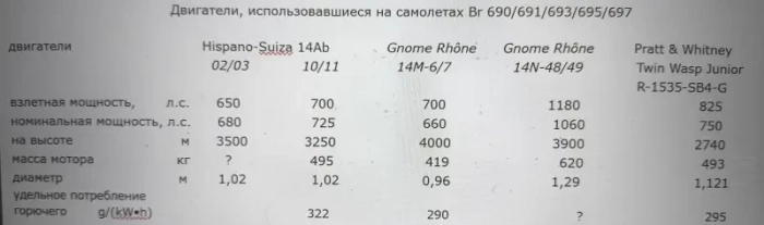 Но самое главное — чтобы обеспечить горизонтальную маневренность на уровне одномоторных истребителей, максимальный взлетный вес был ограничен тремя тоннами, что было чистой фантастикой, и лишь позднее (когда — неизвестно) эта цифра была увеличена до 3,5 тонн. Это, в свою очередь, ограничило выбор мотоустановки: либо моторы водяного охлаждения Salmson или Renault мощностью не более 450 лошадиных сил (л.с.), либо моторы воздушного охлаждения — 14М Mars и 14Ab фирм Gnome et Rhône и Hispano-Suiza соответственно, мощности которых на тот момент едва перевалила за 600 л.с. Причем в последнем случае министерство авиации навязывало именно второй — и не потому, что он был лучше, нижеприведенная таблица показывает обратное, а чтобы разрушить монополию фирмы Gnome et Rhône. А уж как фирмы будут укладываться в ограничения по весу с более тяжелыми двигателями — это их дело.