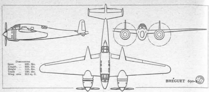 Однако и после официального заказа строительство не продвинулось — в течение почти года (источники называют сроки от 8 до 12 месяцев; истина, видимо, посередине) прототип терпеливо ждал поставки обещанных двигателей Hispano-Suiza 14Ab. Как такое было возможно, не берусь судить, почему Луи Бреге и главный конструктор Жорж Рикар не пытались установить моторы 14М — тоже. Иногда пишут, что эти двигатели были зарезервированы для истребителей P.631, но для H.220 фирмы Hanriot пара моторов все-таки нашлась. Забегая вперед, можно сказать, что именно эта задержка поставила крест на успешной карьере самолета. Лишь к началу 1938 года постройка прототипа была завершена, и 23 марта Breguet Br.690.01 совершил свой первый полет. Заводские испытания прошли успешно, и в июне машина была доставлена на государственные испытания в испытательный центр французских ВВС (CEMA — Centre d'Essais de Matériels Aériens) в Виллакубле.