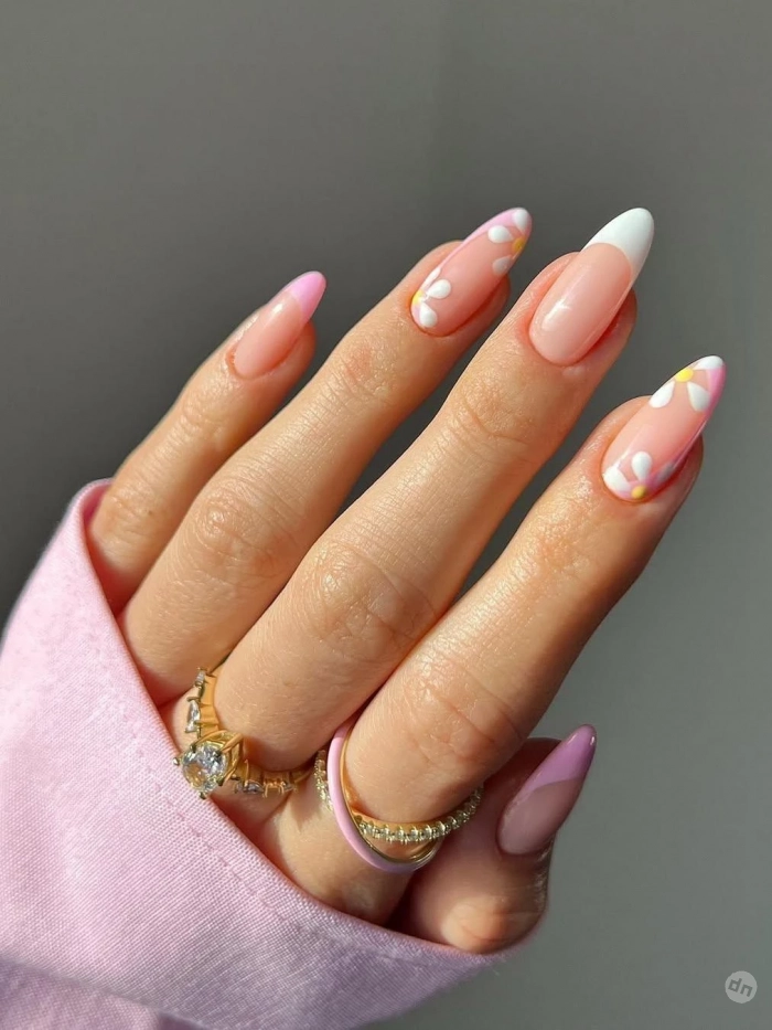 Ромашковый маникюр — это символ весны, легкости и свежести. Цветы, расположенные аккуратно на ногтях, создадут ощущение цветущего луга. Вы можете выбрать как миниатюрные цветы, так и более крупные ромашки, образующие венок, который обвивает ноготь. Важно соблюдать баланс и не перегружать маникюр деталями.