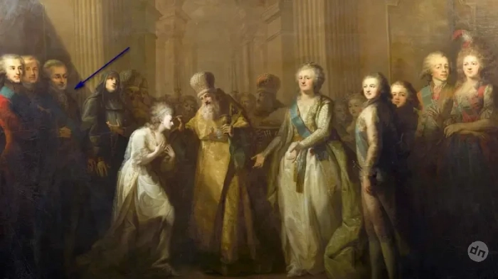 А. Безбородко на картине Е. Машкова «Миропомазание великой княгини Елизаветы Алексеевны» (указан стрелкой)