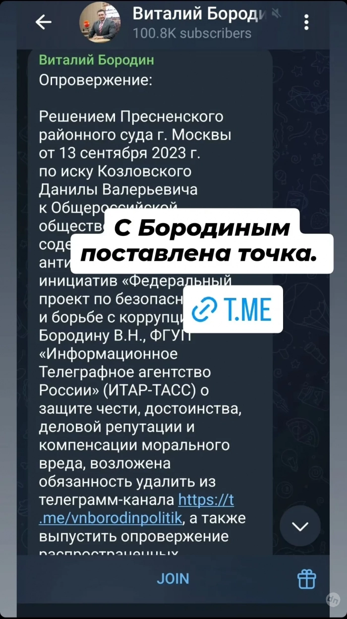 "С Бородиным поставлена точка. Мне было важно защитить репутацию от этого бреда, потому что я живу в Москве, я никуда не "убегал", я дома и я никогда не переставал любить свой дом", — написал Козловский в своём инстаграме*.