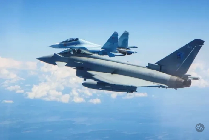 Российский истребитель Су-30СМ и британский истребитель «Тайфун» над Балтийским морем во время миссии по патрулированию воздушного пространства над Балтийским морем в мае 2019 года.