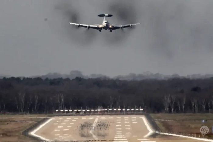 Самолёт системы дальнего радиолокационного обнаружения и управления (АВАКС) НАТО E-3A взлетает с авиабазы НАТО в Гайленкирхене, Германия.