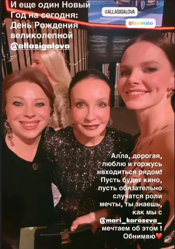 Софья Эрнст, Анна Чиповская и Алла Сигалова/Фото: личный архивАлла Сигалова/Фото: личный архивАнастасия Перова, Алла Сигалова и Елизавета Боярская/Фото: личный архивРанее в январе Константин и Софья Эрнст посетили премьеру музыкального спектакля Аллы Сигаловой "Щастье!" в Театре Моссовета.