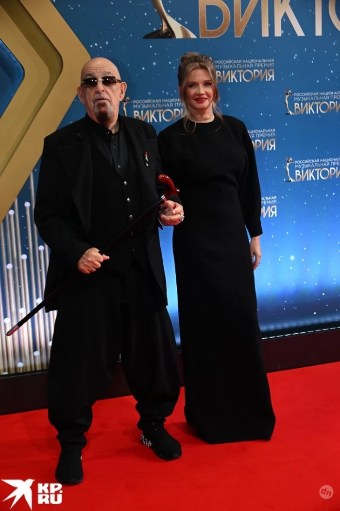 77-летний Михаил Шуфутинский появился на звездной дорожке в модном черном костюме и с элегантной тростью. Рядом с королем шансона была его молодая муза Светлана Юразова, которая младше его на 30 лет.
