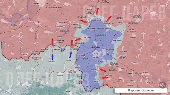 К настоящему моменту российские штурмовые подразделения продвигаются юго-западнее Мелового и уже вышли к автомобильной дороге, которая ведёт в Сумскую область. Это местная дорога, по которой ВСУ в последние месяцы осуществляли снабжение своего гарнизона в Судже. Перерезание этого маршрута снабжения ещё больше осложняет для противника ситуацию со снабжением на оккупированных им территориях Курской области и фактически делает невозможной ротацию по так называемому южному маршруту - через Меловой и Гончаровку.
