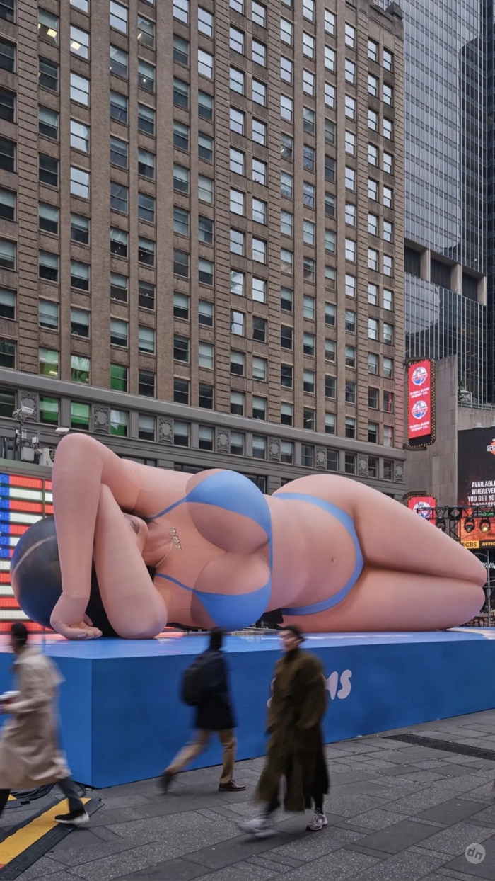 Ким Кардашьян разместила свою 18-метровую копию в центре Таймс-сквер в честь новой коллекции купальников своего бренда Skims. Концепцию разработала Эми Куле из креативного агентства Merry Wonderer.