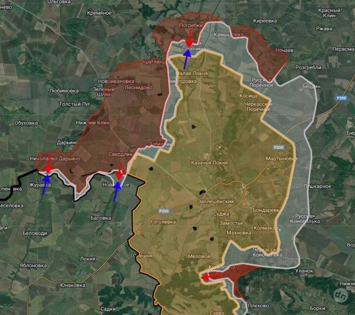 Российские войска давят с опорой на Николаево-Дарьино и Свердликово в направлении Сумской обл., имеют тактические успехи в районе Журавки и Новенького;