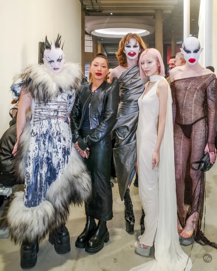 Основательница концепт-стора КМ20 Ольга Карпуть пришла на шоу в том же платье от Рика Оуэнса, в котором позировала вместе с ним на светском ужине в Лувре, а дебютное появление Zivert на Неделе моды в Париже привело к скандалу в телеграме. Певицу собрал на показ её стилист Николай Овечкин, что не понравилось его коллеге Михаилу Барышникову: Zivert позировала в тотал-образе бренда и пообщалась с супругой и музой дизайнера Мишель Лами. Виктория Салават надела на мероприятие готический образ от российского дизайнера Татьяны Кочновой, а макияж ей сделала популярная визажистка Фариза Родригез.
