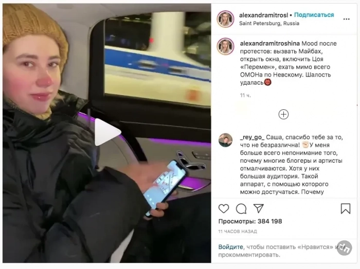 В итоге в какой-то момент Митрошина стала больше внимания уделять политике. Она критиковала российские власти за "высокую толерантность к насилию", со временем стала открыто характеризовать себя как оппозиционерку, участвовала в протестных акциях, делала политические заявления. Так, в 2021 году Митрошина выступила в защиту Алексея Навального***, вернувшегося на родину после комы и попавшего под арест. А ещё арендовала Maybach, на котором проехала мимо отряда ОМОН под песню Виктора Цоя "Хочу перемен!".Митрошина на митинге в поддержку сестер Хачатурян, август 2019 года/Фото: кадр из видео/ YouTube-канал "А поговорить?"Митрошина едет на Maybach мимо отряда ОМОН под песню Цоя/Фото: alexandramitroshina/Instagram*"Меня часто спрашивают, куда бы я переехала [из России]. Я бы никуда не переехала. Я бы очень хотела продолжать жить именно здесь, вносить свой вклад в жизнь России, платить российские налоги. У меня нет, условно говоря, завода, который можно "отжать", нет каких-то конкретных рычагов давления на меня. Когда тебе нечего есть, у тебя гораздо страшнее цена ошибки. Если меня арестуют на митинге, ничего особо не произойдёт. Даже если мне выпишут самый большой штраф, я его просто заплачу. В моём положении гораздо легче проявлять гражданскую позицию, потому что у меня есть силы и ресурсы", — говорила Митрошина в 2021 году в том же интервью Шихман**.