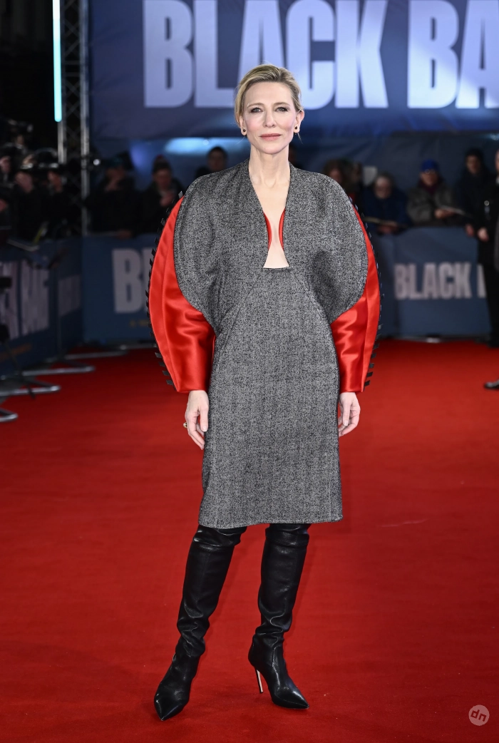 55-летняя Кейт Бланшетт надела приталенное платье из шерсти с красными рукавами, вырезом и открытой спиной. Платье сделал бренд Louis Vuitton, вдохновившись коллекцией осень-зима — 2023.