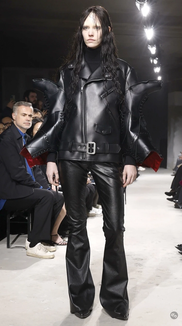 Еще один японский модельер Джуниа Ватанабе пофантазировал на тему оригами в одежде. Так, по подиуму прошлась модель в тренче, который, как будто выкроили методом оригами. Еще один запоминающийся образ — кожаная куртка с пришитыми к рукавам сапогами. Японские дизайнеры явно наступают на пятки Демне Гвасалии.
