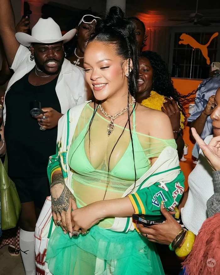Рианна для мероприятия выбрала зелёное платье-пачку с рюшами, неоновый лиф от купальника и бейсбольный бомбер. Она дополнила образ бриллиантовым колье Sabyasachi, которое ранее надевала актриса Голди Хоун на "Оскаре-2025", и новыми кроссовками Fenty x Puma в тропических оттенках, вдохновлённых Барбадосом. На вечеринке гости танцевали и фотографировались с Рианной.